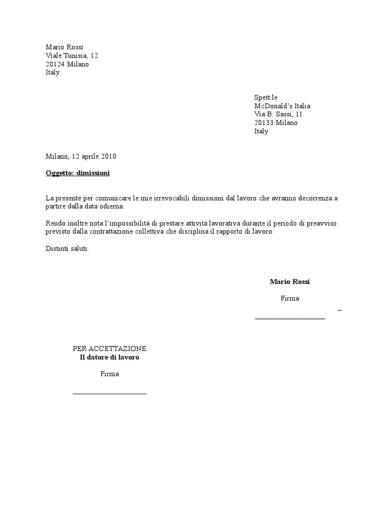 Lettera dimissioni in bianco