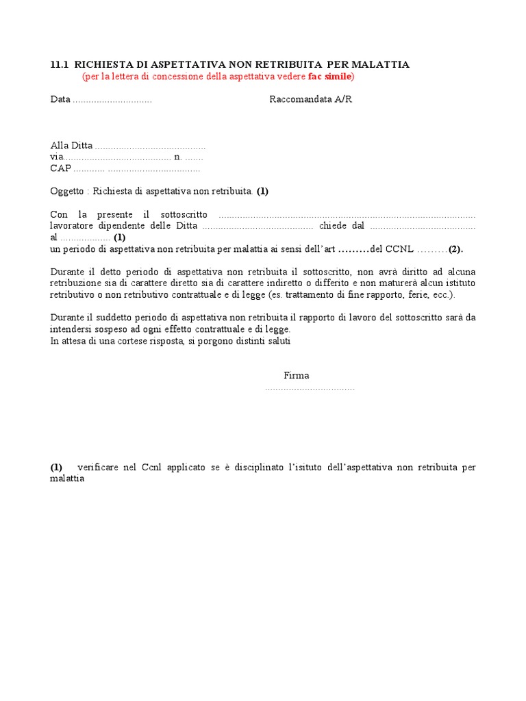 Richiesta Di Aspettativa Non Retribuita Per Malattia | PDF - Scribd 11. 1 RICHIESTA DI ASPETTATIVA NON RETRIBUITA PER MALATTIA. (per la lettera di concessione della aspettativa vedere fac simile) Data ... Richiesta aspettativa non retribuita: modelli editabili - Moduli.it La richiesta aspettativa non retribuita può essere formulata solo in precise circostanze definite dalla legge o dal CCNL: gravi motivi familiari, ...